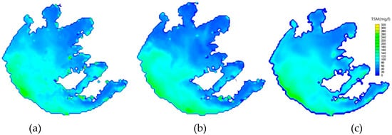 Figure 8a is the initial TSM concentration distribution at the beginning of the retrieved GOCI simulation. The high TSM concentration area is at the southwest part of the lake and highest close to the lakeshore. Figure 8b represents the distribution after 10 days calculated from the GOCI data, while Figure 8c shows the simulation result after 10 days. Due to the dominant clockwise flow, the TSM concentration results from the simulation under wind effect shows that it is even higher at the lakeshore and the highest TSM region spread to the entire southwest lakeshore. The same results can be found from the GOCI results after 10 days. Both from observation and simulation, the trend of the TSM concentration is to gather along the entire southwest lakeshore. Overall, the spatial distributions of the model simulated TSM are consistent with the GOCI observations.