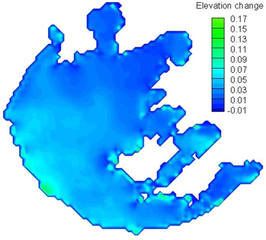 Figure 9 shows the bed displacement result from the simulation. In general, the sedimentation is positive in almost all the area of the lake. The greatest deposition is as large as 0.1 meter in this 10 day period simulation. This means the deposition rate is greater than the resuspension rate, which means that most of the time the shear stress created by the wind is less than both the critical resuspension shear stress and the critical deposition shear stress. The location of where the large amount of the deposition happens can be explained by incorporating the velocity and TSM concentration results in Figure 7 and Figure 8. There are two different situations where sedimentation occurs. One is where the velocity is always low and the TSM concentration is not the highest, giving a large deposition rate, such as the zigzag lakeshore at the east and north of the lake, as well as the area around the mid-lake island. The other one is that the concentration is the highest and velocity is large most of the time, such as at the southeast lakeshore. This agrees with the equation from Equation (10) to Equation (15). Either the large concentration or the deposition duration will result in a relatively big deposition in total, so long as it fits the deposition condition.