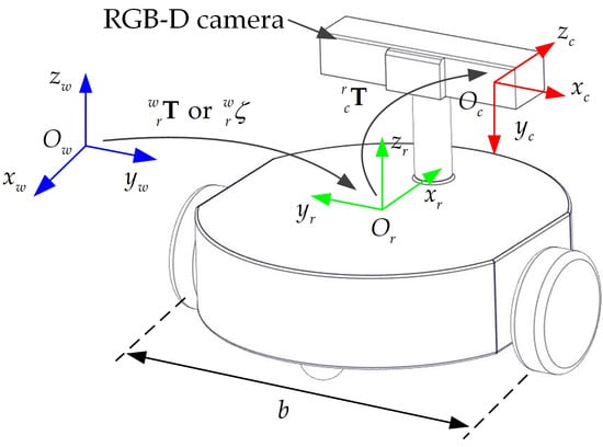 Figure 1 presents a differential-drive robot equipped with an RGB-D camera. Each wheel is mounted with an encoder. We use the following three types of coordinate frames: the world frame , the camera frame , and the robot frame . The world frame is coincident with the robot frame at the start time. The extrinsic parameters and the kinematics parameters of the robot are precalibrated by [32]. The extrinsic parameters, which are expressed by a transformation matrix , are the transformation from the camera frame to the robot frame . The kinematic parameters are the left and right wheel factors , and wheel space b. The wheel factors transform the encoder displacement in unit tick to the wheel displacement in unit m. The robot pose is the transformation from the robot frame to the world frame , which is expressed by a transformation matrix . In fact, the robot pose only contains three degrees-of-freedom (DoF), as the robot only moves in a 2D plane. Thus, the robot pose can be expressed by a vector: , is the translation, and is the yaw angle. Then, takes the following form: