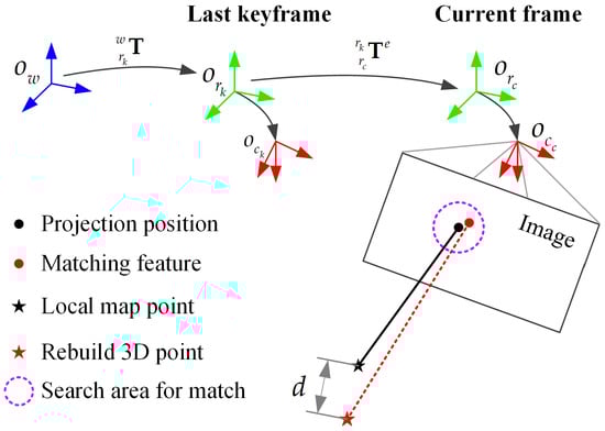 Then, we track the local map. The local map refers to the keyframes (local keyframes) that are close to the current frame in distance and view angle, as well as the map points (local map points) viewed by the local keyframes. The distance threshold is set to 4 m, and the angle threshold is set to 1 rad in our implementation. The local map points are projected onto the current image to match with the ORB features. Note that the dynamic and static properties of the ORB features of the current frame are unknown, so there may be some erroneous matches. To solve this problem, we propose two policies: (1) limiting the matching search area and (2) using the depth image data to remove erroneous matches. We detail them as follows.