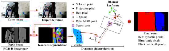As shown in Figure 4, the pixels in bounding boxes of dynamic objects are culled first. Then, the remanding pixels are projected to 3D to create a point cloud. We use the K-means method to segment the point cloud into several clusters. The clusters are assumed to be rigid bodies, which means that the pixels in the same cluster have the same motion property. This assumption is reasonable because we focus on removing dynamic pixels and building static maps but not tracking dynamic objects. The number of clusters, k, is determined according to the size of the point cloud: . is the average point number of a cluster to be adjusted. Reducing guarantees a better approximation, but it also increases the computational burden. We set to be 6000 to balance the computational consumption and precision.