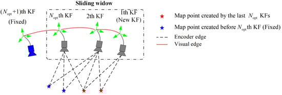 A sliding window local bundle adjustment is applied as shown in Figure 5. The states participating in the optimization are the robot poses of the last keyframes, the last th keyframe, as well as the map points not only observed by the last keyframes but also observed by at least two keyframes. The last th keyframe and the map points created before the th keyframe are fixed during the optimization. The cost function is defined by