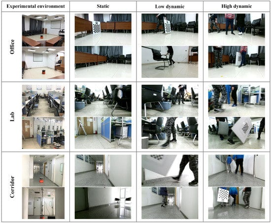 Experimental environments and RGB images in the static, low dynamic, and high dynamic data sequences.