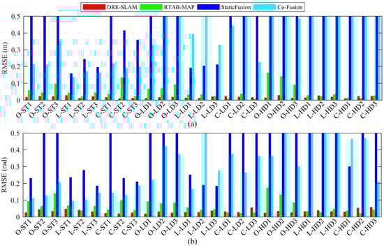 The root-mean-square-error (RMSE) of (a) the translation (m) and (b) the rotation (rad) comparison of the four methods in all the sequences.