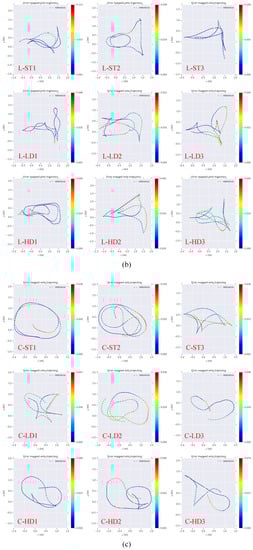 As shown in Figure 8, we collected data in three different environments: office (O), laboratory (L), and corridor (C). The office environment is clean and tidy. The lab environment is messy and rich in texture and structure information. The corridor environment is full of white walls and less in texture and structure information. We collected three types of data, static (ST), low dynamic (LD), and high dynamic (HD), in each environment. In the static data, there are no moving objects. In the low dynamic data, only one person is moving. In the high dynamic data, three persons are moving. The persons move with tablets, chairs or other undefined objects. The purpose is to verify the recognition capability of the dynamic pixels on undefined objects. Three sequences were collected for each type of data. A total of 27 sequences were collected for the comparative tests. Each data sequence is named using the environment type and data type. For example, O-ST1 is the first sequence collected in the static (ST) office (O) environment. The four approaches were tested in all these 27 sequences.