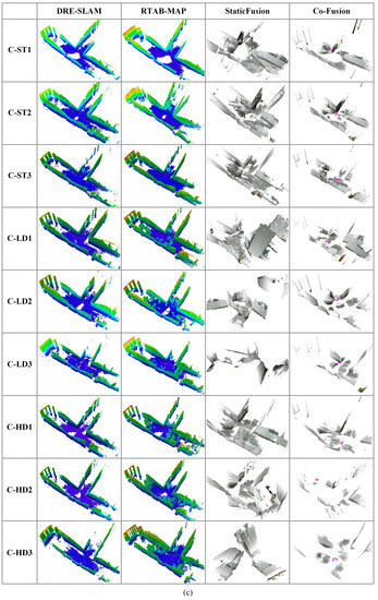Figure 11 provides all maps created by the four methods with all the data sequences. DRE-SLAM constructed clean background maps in most sequences. There are no obvious distortions in these maps. This proves that DRE-SLAM can reliably construct static maps in both dynamic and static environments. The RTAB-MAP constructs nice maps in most static sequences. However, many dynamic objects are introduced in its maps in the low and high dynamic sequences. Some maps even contain obvious distortions, e.g., maps of O-HD1and C-ST2. StaticFusion obtains nice maps in the static and low dynamic lab sequences. This may benefit from the rich structure of the lab environment. However, in other sequences, its maps suffer a lot of distortions. We find that StaticFusion treats many static pixels as dynamic pixels. Co-Fusion can build correct maps in most static sequences, but the maps are obviously confusing in the low and high dynamic sequences. We can also see that DRE-SLAM and RTAB-MAP, which fuse encoder information, produce maps with fewer distortions. Whereas the pure RGB-D methods, StaticFusion and Co-Fusion, create maps with more distortions. This phenomenon indicates that using the encoder is helpful to improve the map quality. The quality of the map is mainly determined by the pose accuracy of the keyframes and the dynamic pixels’ culling effect. The sounder map quality of our system in Figure 11 further shows that our method produces high pose accuracy and a dynamic pixel culling effect.