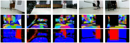 Typical results of the dynamic pixels culling module. The first row includes the predefined dynamic object detection results. The second row includes the results of K-means segmentation using the depth images. The third row shows the final dynamic pixel detection results. The red pixels are dynamic, the blue pixels are static, and the black pixels are pixels with invalided depth values.