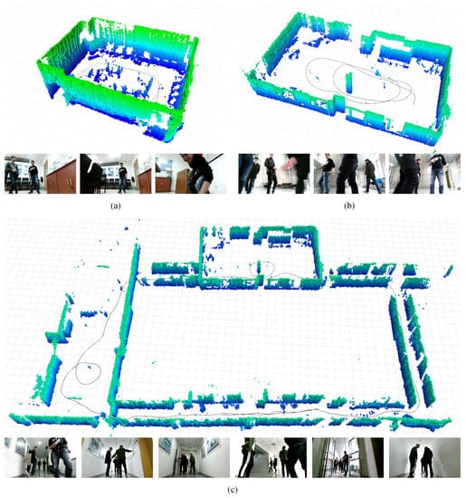 Results of the extension tests. (a) 8 m × 6 m office (Voxel size: 0.05 m), (b) 15 m × 9 m hall (Voxel size: 0.05 m), and (c) 37 m × 27 corridor (Voxel size: 0.1 m). The black lines are the robot trajectories of keyframes.