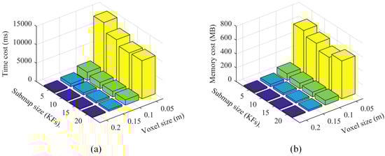 The time costs of the map update, when the loop has been closed, are shown in Table 2 and Figure 14a. Compared with the retrace method, our approach dramatically reduces the time consumption. The improvement rate is over in all the configurations. The improvement is more obvious when raising the voxel size or increasing the submap size. As seen from Figure 14a, the parameter that mainly influences the time cost is the voxel size. The submap size num has less effect. In other words, the time consumption will not increase too much when we choose a smaller submap size.