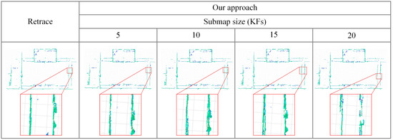 Figure 15 compares the map of retrace with the maps of our method in different submap sizes. The voxel size of the maps is 0.05 m. It can be seen that as the submap size increases, the distortion of the map tends to become larger. This is because the error of the sub-OctoMap increases with the submap size. There are no visible differences between our map with the retrace map when the submap size is 5. Combined with the above findings, we recommend setting the submap size to 5 and the voxel size to 0.1 m to obtain a balanced mapping performance.
