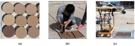 Scenes for spectra measurements of soils in the three states (experiment parameters: (1) field angle: 8°; measurement distance: 15 cm; (2) field angle: 8°; measurement distance: 15 cm; and (3) field angle: 25°; measurement distance: 1 m). (a) Powdered soil; (b) aggregate soil; (c) cracked soil.