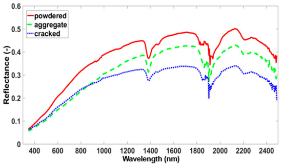 In general, spectral reflectance is influenced by the soil moisture, salt content, surface roughness, organic carbon, etc. [31]. As shown by previous research, spectral features of soils are in inverse exponential correlation with soil moisture [32,33,34]. This means that when the moisture content increases, the spectral reflectance decreases. Researches also showed that the soil reflectance decreases with soil salt content [35,36]. In the current study, we took dried soil samples as the study object, which can be considered to have the same moisture content, and the main factors that determine the spectral reflectance are salt content and surface roughness. For a certain soil sample, the salt content was the same in different states, leaving surface roughness as the single determining factor for spectral features. Powdered soils, having the smoothest surface, showed the highest reflectance since the powder particles are all smaller than 0.9 mm in diameter; aggregate soils are less smooth since particles stick to each other more tightly; and cracked soils are the least smooth because of cracks.