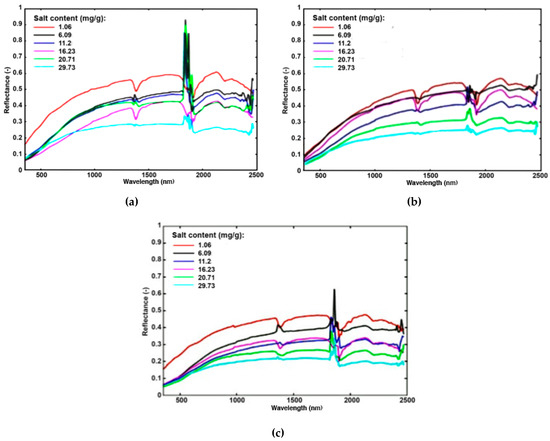 Spectral reflectance of soil samples with different salt content. (a) Powdered soil; (b) aggregate soil; and (c) cracked soil.