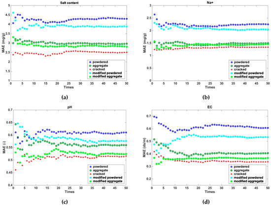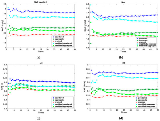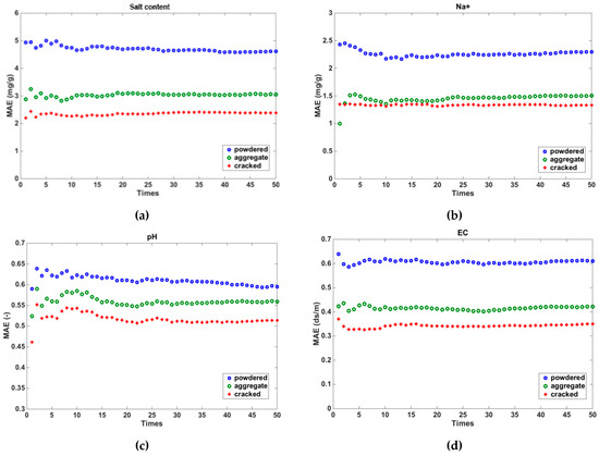 Mean absolute error (MAE) derived from the multiple linear regression model for soils in different states. (a). Mean absolute error for salt content; (b). Mean absolute error for Na+; (c). Mean absolute error for pH; (d). Mean absolute error for EC. Note: since pH does not have a unit, then the MAE of pH does not have a unit either.