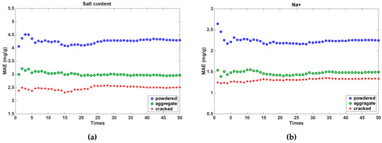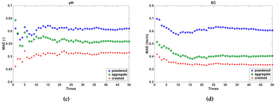 In order to validate the model, we randomly selected 40 samples to determine the fitting coefficients using the aforementioned method, and calculated the MAE of the other 17 samples. The same process was repeated 50 times. Figure 8 presents the MAE for soils in the three states for all the times. As illustrated, the MAE showed the lowest values for cracked soils, indicating that the regression model achieved the highest accuracy for cracked soils.