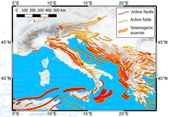 Map of individual seismogenic sources in the Alpine Mediterranean area provided by Database of Individual Seismogenic Sources DISS [25]. Active faults are shown with red lines, active folds in orange. Composite seismogenic sources (formerly seismogenic areas) represented with the coupling of orange and red stripes are based on geological and geophysical data and are characterized by geometric (strike, dip, width, depth) and kinematic (rake) parameters.