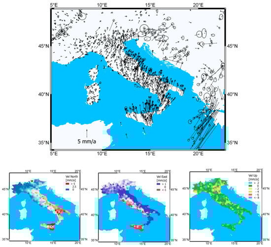 Top—Horizontal velocity residuals with respect to the European reference system (ETRS89) and their uncertainty ellipses at 95% confidence level. The map shows also GNSS velocities of the sites displaced around the study area. Bottom—Map of single components (North, East, Vertical) of ground surface velocity derived by GNSS permanent stations of the study area.