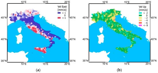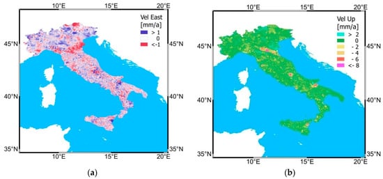 East (a) and vertical component (b) of velocity correction to apply to PS radar interferometry velocities derived by their calibration with GNSS permanent stations.