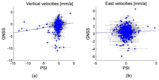 Comparison of the GNSS and SAR velocity components (vertical—a, East—b) calculated for each of 621 GNSS sites. The SAR velocities were calculated by applying exponential inverse distance weighting [41,42] to a cloud of points 1000 m from each GNSS site. The blue lines represent the Pearson correlation between the two techniques. The Pearson correlation coefficient is 0.19 for the vertical component (top-left) and 0.028 for the east component (top-right).