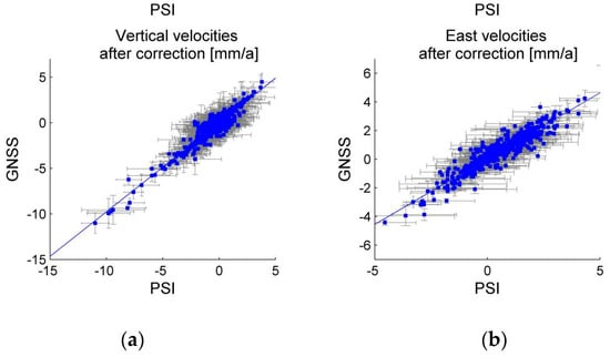 Comparison between GNSS and SAR velocity components after the correction (vertical—a, east—b) calculated for each GNSS site. The Pearson coefficients (blue lines) after the correction changed from 0.19 to 0.95 for the vertical component (a) and from 0.028 to 0.94 for the east component (b).