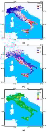 Velocity field components derived by the combination of GNSS and PS radar interferometry related to the Eurasian reference system(ETRS89). a—North component: velocities higher than 5 mm/a toward the North are plotted in a red scale color, white for velocities around 2.5 mm/a and stable part are in blue, no movements toward the South are recorded. b—East component: the values in red indicate movement towards the East, and values in blue indicate movement towards the West; the relative stabilities are plotted in white. c—Vertical component: Cyan represent uplift, green represents the stable part, and colors from yellow to violet represent a downward increase.