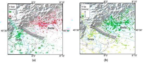 East (a) and vertical (b) velocity components between the cities of Ivrea and Biella placed along the border between the Po Plain and the Eastern Piedmont Alps. The boundary that separates the two kinematic zones that run along the morainic ridge is represented by a light grey line.