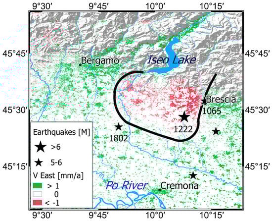 East component of the velocity field in Brescia and the main historical earthquakes (years 1065, 1222, and 1802). The black line marks the boundary of the two kinematic zones that run in opposite directions.