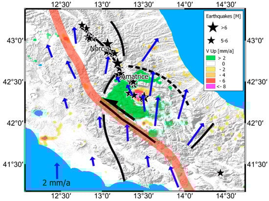 Map of the dynamics of Central Italy and the main earthquakes that have occurred in recent years [1990–2017]. The red line identifies the Moho deep discontinuities [25], the black lines mark the discontinuities, and the blue arrows represent the main horizontal velocity trends derived by GNSS stations and represented with respect to the Eurasian reference frame (ETRS89). The background colors represent the vertical velocities of PS corrected by GNSS.