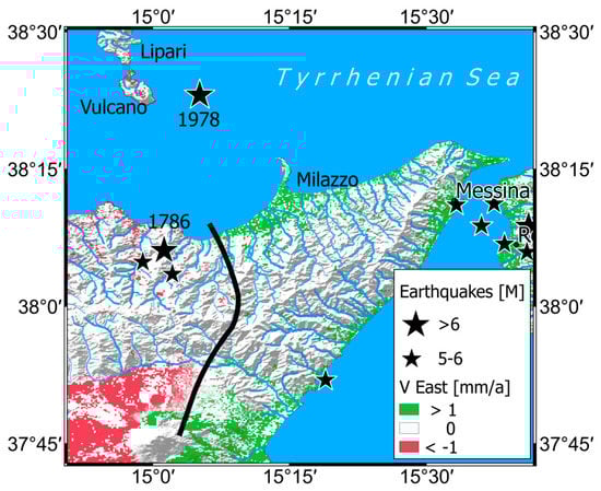 The Tindari-Letojanni line crosses NE Sicily from the Tyrrhenian coast of the Gulf of Patti to the Jonian coast near Taormina Most of the authors prefer the Tindari—Letojanni as a segment of the Aeolian-Tindari-Letojanni Fault System (ATLFS) due its position along the Lipari—Vulcano volcanic alignment and the clustering of other major earthquakes in the Patti Gulf (Mw = 6.2, 10 March 1786 and Mw = 6.1 16 April 1978) and large numbers of minor events also on the mainland. This zone of deformation consists of a broad NNW trending system of faults that includes sets of right-lateral, left-lateral, and extensional faults as well as early strike-slip faults reworked under late extension [59]. Instead, the Taormina Line shows neither a similar market seismic activity nor current evidence of right-lateral decoupling [60].