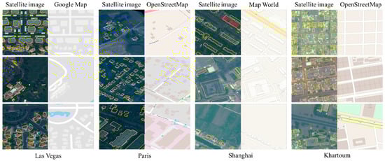 Besides the multispectral satellite imagery, we also used several public GIS map datasets as the auxiliary data for our proposed method because of the extra useful information they provide for building footprint extractions. Contrary to previous studies that used single-source auxiliary GIS data, we selected the map dataset with the most abundant information from several public GIS map datasets for each city. For Las Vegas, we selected the Google Maps dataset [59], which contains more information than the OpenStreetMap [58]. For Paris, we selected the popular OpenStreetMap dataset because of its abundant information. For Shanghai, we selected the MapWorld dataset [60] because it contains abundant information on buildings and there is no coordinate shifting between that dataset and the satellite imagery. For Khartoum, we selected the OpenStreetMap dataset, which is slightly more informative than the Google Maps dataset but still lacks building information for most areas. All of the map datasets were collected in a raster image format, according to the geospatial information of their corresponding satellite images (i.e., longitude, latitude, and spatial resolution) and resized into 650 × 650 pixels for further integration with the satellite imagery. Examples of the multi-source GIS map images and corresponding satellite images can be found in Figure 1.