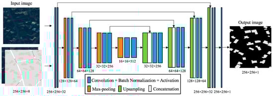 In this study, the semantic segmentation model for the building extraction is based on the U-Net architecture [61]. U-Net is a popular deep convolutional neural network architecture for semantic segmentation and has been used in several satellite image segmentation studies [5,12,30,62]. Since U-Net was initially designed for the binary segmentation of biomedical images with a relatively small number of training samples, it is a good choice for the building extraction task in this study as well. We modified the size of layers in the U-Net architecture to fit our building extraction task. We also added a batch normalization layer behind each convolutional layer.