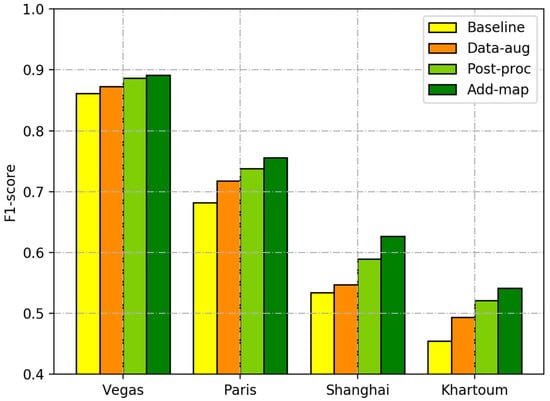 In this section, we compare and analyze the effects of each strategy in our proposed method on the building footprint extraction results in different cities. Table 7 shows the precision, recall, and F1-score of the four cities after applying the different strategies. The numbers in bold type indicate the highest values. Baseline refers to training the semantic segmentation model using the rescaled satellite images. Data-aug (data augmentation) refers to training the semantic segmentation model using the augmented satellite images. Post-proc (post-processing) refers to applying the post-processing strategy to the integrated results of the baseline and data-aug. Add-map (adding GIS map data) refers to integrating the results obtained from the satellite image–based dataset collection with those from the combined satellite and GIS map image–based dataset collection. The F1-scores obtained after applying the different strategies are summarized in Figure 5.