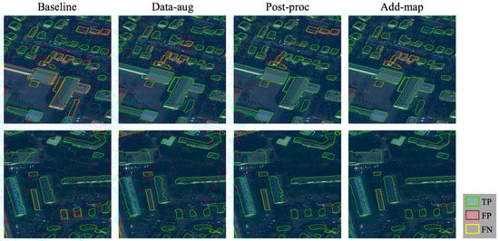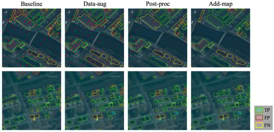 Figure 6, Figure 7, Figure 8 and Figure 9 show some examples of the building footprint extraction results after applying the different strategies in which green, red, and yellow polygons denote correctly extracted buildings (TP), other objects extracted as buildings by mistake (FP), and ground truth buildings that were not extracted correctly (FN), respectively. The experimental results demonstrate that the proposed strategies led to remarkable improvements in the building footprint results in many aspects. For instance, we could obtain more complete building outlines (e.g., the top images in Figure 6, Figure 7 and Figure 8), and the neighboring buildings were more likely to be successfully extracted separately (e.g., the bottom images in Figure 8 and Figure 9). Moreover, there was less confusion between tiny buildings and noise in the results (e.g., top images in Figure 6 and bottom images in Figure 8). Analysis about the results regarding the actual situation in different cities is demonstrated in the following section.