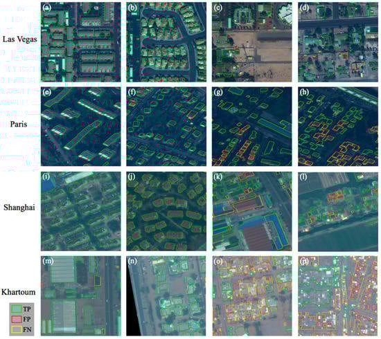 Figure 10 shows typical examples of the footprint extraction results obtained from our proposed method in the four cities. The two left columns of the images are selected examples with good results. The two right columns are selected examples with inferior results. The results of our proposed method are analyzed based on the specific situation of each city as follows.