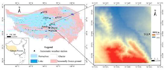 Observation data were collected from seven automatic weather stations: (Xidatan (XDT), Tanggula (TGL), Ayake (AYK), Zuonaihu (ZNH), and MS3478 (NPAM) in the permafrost region and Amdo, MS3637 (SPAM) in the seasonally frozen ground regions) on the Qinghai-Tibet Plateau (QTP) (Table 1). A 10 × 10 km permafrost region (33°0.8′N~33°6.6′N, 91°51′E~91°56.7′E) at Tanggula (TGL) was selected for the validation case study (Figure 1). The background maps on the left and right of Figure 1 are the spatial distribution map of frozen ground on Qinghai-Xizang Plateau [42] and ASTER Global Digital Elevation Model respectively.