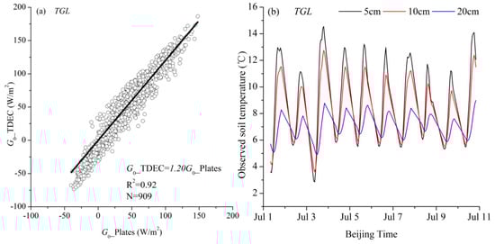 Linear relationship between G0_TDEC and G0_Plates (a) and the temporal variation characteristics of soil temperature at the TGL site, at depths of 5 cm, 10 cm, and 20 cm (b).