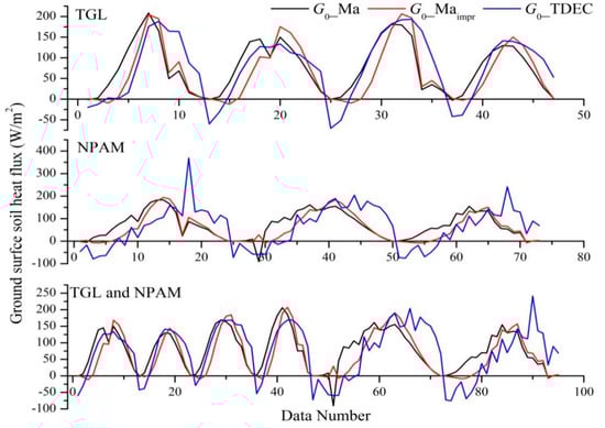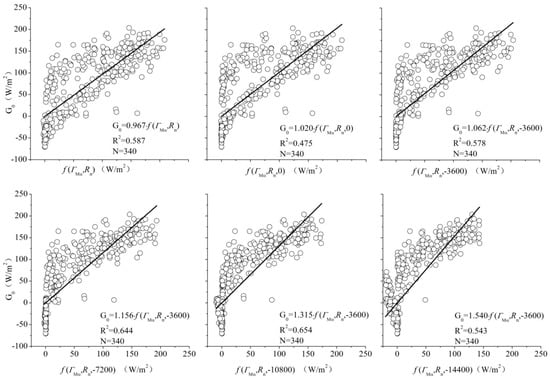 The G0 calculated by the Plates method somewhat underestimates the actual value (Figure 3a). Plates (Equation (1)) assumes that the volumetric soil heat capacity cs is the same between the surface and underground depths of 5 cm (1.18 × 106 J·m−3·K−1) and that the soil temperatures at different depths have the same rates of change at any time. The rate of change of soil temperature with time over a set period, however, increases with the decrease of soil depth (Figure 3b). The TDEC method has been shown to be insensitive to the soil thermal conductivity coefficient, and its reliability has been verified by the twin experiment [22]. Some studies on the plateau have shown that the TDEC method has better accuracy [12,13,45]. In this study, the values of G0 at the Amdo, NPAM, SPAM, and TGL sites were acquired using the TDEC method. G0 at the other sites was calculated by the Plates method because of the limited availability of measured data (Table 1). The TGL site data could be used for both the Plates and the TDEC. Data from the four sites (XDT, AYK, ZNH, and TGL in 2014), which could be used with the Plates method, was used to calibrate the four existing models, to evaluate their applicability on the plateau, and to select the best applicable scheme (Section 3.2 and Section 4.1). Data from four sites (Amdo, NPAM, SPAM and TGL) satisfying TDEC were then used to obtain an improved scheme based on the applicable scheme (Section 3.3 and Section 4.2) and to verify the reliability of the improved scheme at those sites (Section 5.1).