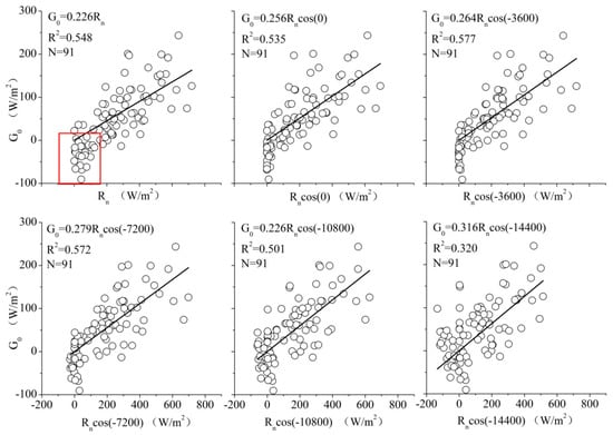 Regardless of whether or not phase offset or how much phase offset is considered, the simulation results are not good in the negative part of G0 (Figure 5). It should be related to the actual relationship between the “measured” G0 and measured Rn at sites. Most remote sensing-based models to estimate G0 are established on the basis of the relationship between G0 and net radiation Rn. These models consider other land surface parameters, such as land surface temperature, albedo and vegetation index, in order to better simulate G0/Rn values. The purpose of this manuscript is to establish a G0 parameterization scheme in sunny days on the QTP. The standard for daytime selection is that net radiation Rn is greater than 0. It can be seen that the relationship between the “measured” negative G0 and the simulated results f (ΓMa, Rn, c, t) (It can be approximated as G0 analog value, Figure 5) is very similar to that between the “measured” negative G0 and observed Rn (the red box area in Figure 6). Therefore, it is caused by the relationship between the “measured” negative G0 and measured Rn that the simulation results of remote sensing-based models in the negative part of G0 are not satisfactory during daytime of the clear-sky days. According to in situ measurement data of sites, the majority of the “observed” G0 are larger than 0. So the poor effect of negative simulation will affect the application of these models in daytime.