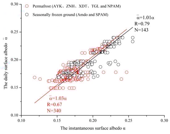 Relationship between the land surface albedo instantaneous value α and the daily mean value α in permafrost and seasonally frozen ground.