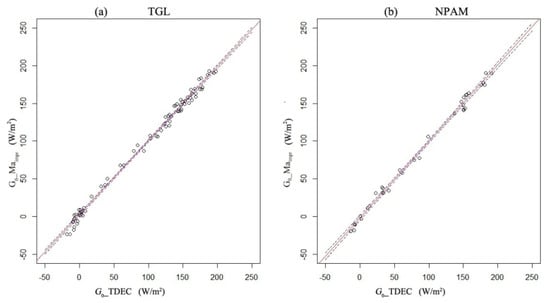 The linear relationship between the land surface soil heat flux G0 calculated by the TDEC method (G0_TDEC) and the parameterization scheme Maimpr (G0_Maimpr) using measured data from the TGL and NPAM sites (the red line represents a straight line with a slope of 1 and an intercept of 0). The blue line represents the 95% confidence interval line. Land surface temperature Ts is obtained by Equation (2) using observed long wave radiation.