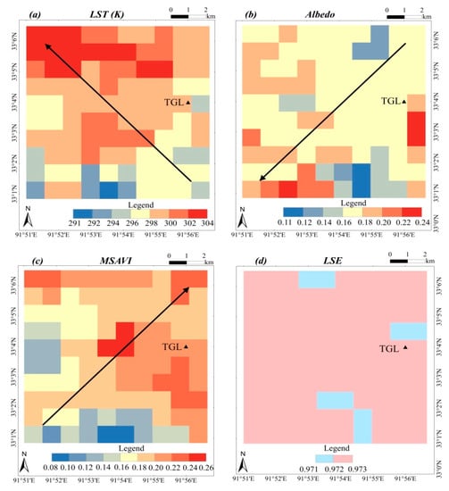 where α is the land surface albedo (Equation (14)), σ is Stefan-Boltzmann constant (5.67 × 10−8 W m−2·K−4). DSR and DLR are the incoming short and long wave radiation fluxes, respectively (W/m2). DSR and DLR in the study area were only a little different, and they could be replaced by actual values of DSR and DLR at the TGL station measured when the satellite transited [58]. The land surface temperature Ts was directly obtained from the MODIS land surface temperature data product MOD11_L2. The land surface emissivity εs was estimated using the MYD11_L2 data product and a nonlinear formula [59]:
