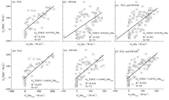The coefficients of determination (R2) of the linear relationship between f(Γbest, Rn, c, t) and G0 in the case of different phase shifts are obtained from the in situ measured data. The phase shift corresponding to maximum R2 is taken as the optimal phase offset c between G0 and f(Γbest, Rn, c, t) at a site. Taking TGL as an example, the relationship between f(ΓMa, Rn, c, t) and G0 in the case of different phase shifts c (Figure 5) is obtained from the observation data from TGL (Table A2 in Appendix B), and the best phase shift c at TGL can be identified. In the same way, the optimal phase shifts (Table 6) are obtained for the three sites of NPAM, Amdo, and SPAM. The best phase shifts for TGL, NPAM, Amdo, and SPAM are -3h, -5h, and no cos (“no cos” means that the scheme does not include a solar time angle that is to say that it is by default the Ma scheme). The best phase shift is in fact “no cos”, which does not mean that there is no phase shift between G0 and Rn, but only that the phase shift between G0 and Rn in the seasonally frozen soil areas is small (Figure 6). Considering the surface temperature, surface albedo, and MSAVI, the phase shift effect is removed. There is a certain difference in the optimal phase shift c at each site, which may be related to the type of frozen ground at each location. Different types of frozen ground may cause different time differences in surface energy conversion. After considering the solar time angle, the coefficient of determination R2 at TGL and NPAM in the permafrost region does increase, while R2 reduces at SPAM and Amdo, which are located in the seasonally frozen ground region. The Ma scheme still produces the best estimates for the seasonally frozen ground region. The Ma scheme is, therefore, used in the seasonally frozen region, while the model needs further improvement in the permafrost region.