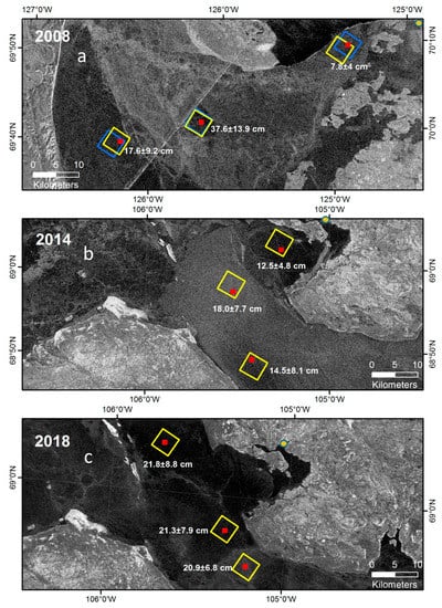 RADARSAT-1 (a) and RADARSAT-2 (b,c) winter season synthetic aperture radar (SAR) images showing Franklin Bay, 2008 (a), Dease Strait near Cambridge Bay, 2014 (b) and 2018 (c) snow covered sea ice case study sites. In situ mean and standard deviation of snow thickness transect locations are indicated by the red squares inside the QuikSCAT/ASCAT (see Section 4.3) (a) and ASCAT (b,c) 4.45 km ASCAT scatterometer sample locations (yellow squares) and QuikSCAT (blue squares). Note the tonal homogeneity within each of the yellow and blue squares.