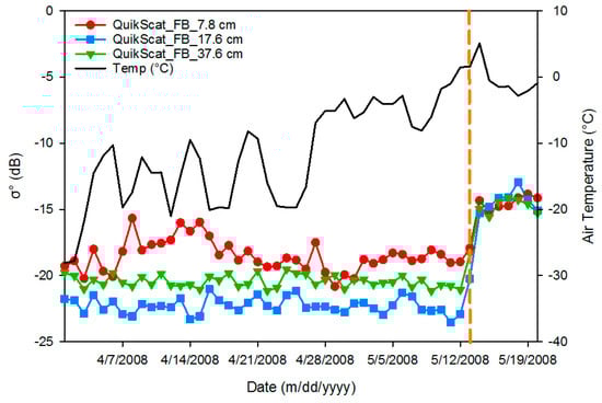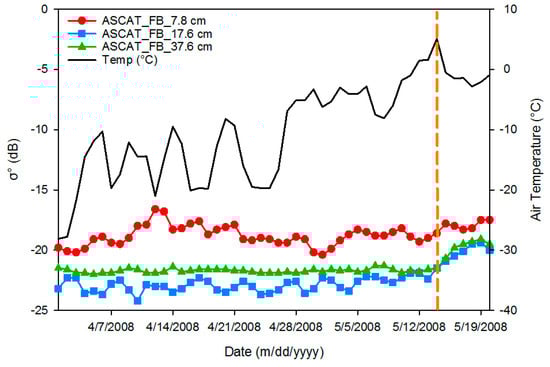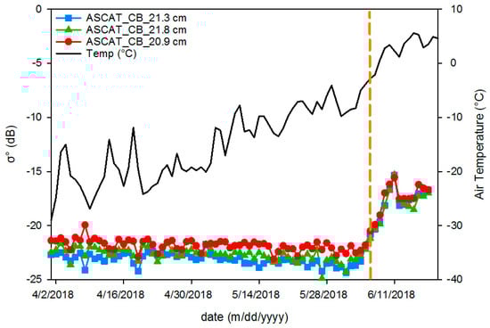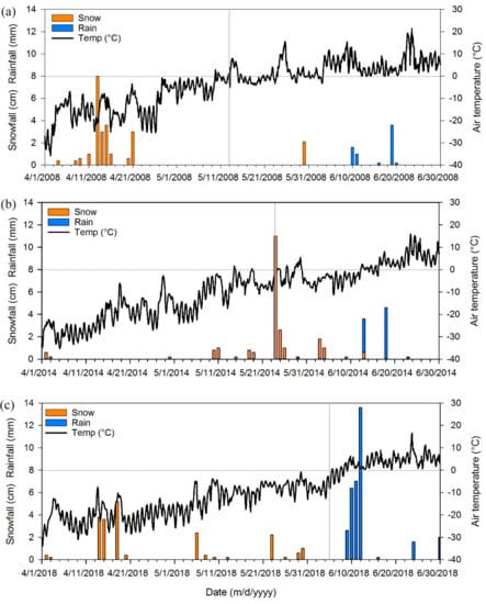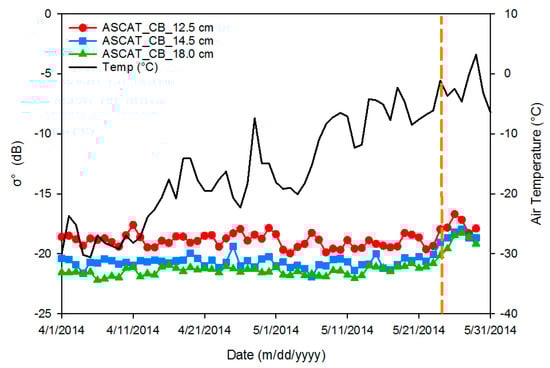 Hourly air temperatures are used to identify and validate the likely date of snow MO, and to identify brief warming periods that approach the freezing mark prior to MO. MO on snow covered FYI is found on the day when the mean air temperature of 3 consecutive days (from one day before to one day after), for the first time, exceeds −0.44 °C [63]. From a time series microwave σ° perspective, MO can be identified as the first major σ° upturn from stable winter σ° values [64,65]. This most often occurs several days earlier than an air temperature identified date of MO on FYI because basal snow layer brine volume and associated dielectric constant increases are sufficiently high at snow-ice interface temperatures of ~−5 °C to initiate a detectable increase in microwave σ° [66,67]. For the FB08 case study, a 42-day period ending the day before MO is selected for analysis (1 April 2008 to 12 May 2008) (Figure 3a). A 53-day period ending the day before MO is selected for analysis (1 April 2014 to 23 May 2014) for CB14. For CB18 case study, 66 days (1 April 2018 to 5 June 2018) are assessed (Figure 3c).