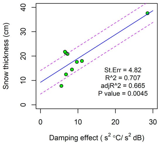 where Ta is the daily mean air temperature over the study period. Both Ta and σ° are detrended using a first-order linear regression prior to calculation of their variances. The resulting measure, , termed the damping effect, is an indication of the ability of the snow cover to moderate the air temperature variance. This is directly related to the thermal conductivity of the snow cover [15]; as the damping effect increases, the thermal conductivity decreases. Therefore, the damping effect is expected to be related to the snow thickness under the assumption of uniform snow density between sites.