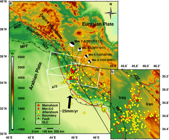 - Vajedian, S.; Motagh, M.; Mousavi, Z.; Motaghi, K.; Fielding, E.J.; Akbari, B.; Wetzel, H.-U.; Darabi, A. Coseismic deformation field of the MW 7.3 12 November 2017 Sarpol-e Zahab (Iran) earthquake: A decoupling horizon in the northern Zagros Mountains inferred from InSAR observations. Remote Sens. 2018, 10, 1589. [Google Scholar] [CrossRef]
