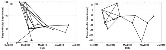 Networks of post-seismic interference pairs from the (a) ascending and (b) descending tracks. For the multidimensional small baseline subset (MSBAS) analysis, 27 ascending and 18 descending track datasets were used, and the perpendicular baselines of all InSAR pairs were less than 80 m.