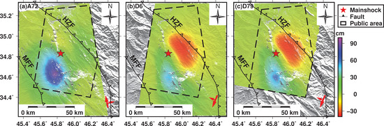 We processed the three selected interferograms (Table 2), and Figure 3 shows the LOS co-seismic deformation fields. A positive value indicates that the deformation in LOS was approaching the satellite; negative value indicates that deformation in LOS was moving away from the satellite. The three interferograms reveal clearly visible co-seismic deformation along the LOS. A72 showed a nearly circular LOS-direction uplift area with a diameter of about 70 km southwest of the epicenter, with a maximum deformation of about 90 cm. Northeast of the epicenter were fewer fringes with a deformation of 15 cm toward the satellite. D6 had co-seismic signals with a double elliptical pattern of deformation with maximum movements that were 50 and 38 cm toward and away from the satellite, respectively. D79 had a co-seismic deformation field that was consistent with that of D6, but the two patterns of deformation in the former were slightly larger, because the radar imaging geometries were different. The results from both the ascending and descending tracks reveal a clear co-seismic signal in the NNW direction, which is consistent with the direction of the strike angle that is given by the United States Geological Survey (USGS) and it is basically parallel with the MFF. Co-seismic deformation showed a continuous deformation pattern, which implies that the fault did not break the surface.