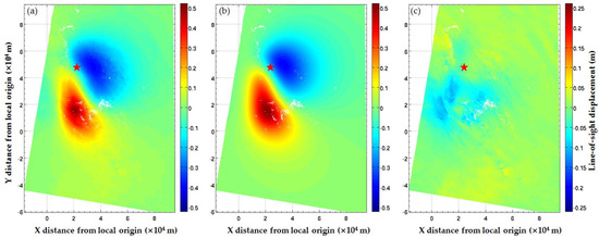 Uniform slip results of the ascending track: (a) observed, (b) synthetic, and (c) residual interferograms. Red stars represent the epicenter.