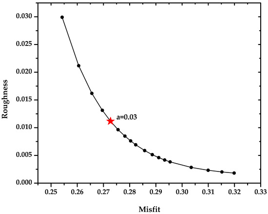 Curve representing the tradeoff between the model roughness and misfit. The red star indicates the location of the optimal smoothing parameter.